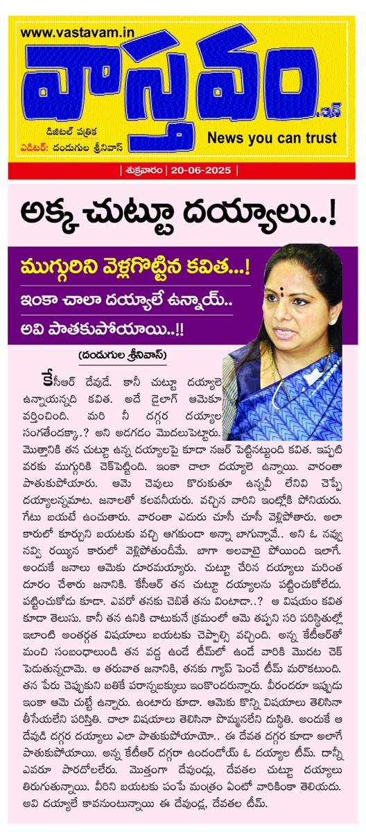ఆ తరువాత జనానికి, తనకు గ్యాప్ పెంచే టీమ్ మరొకటుంది. తన పేరు చెప్పుకుని బతికే పరాన్నబక్కులు ఇంకొందరున్నారు. వీరందరూ ఇప్పుడు ఇంకా ఆమె చుట్టే ఉన్నారు. ఉంటారు కూడా. ఆమెకు కొన్ని విషయాలు తెలిసినా తీసేయలేని పరిస్తితి. చాలా విషయాలు తెలిసినా పొమ్మనలేని దుస్థితి. అందుకే ఆ దేవుడి దగ్గర దయ్యాలు ఎలా పాతుకుపోయాయో.. ఈ దేవత దగ్గర కూడా అలాగే పాతుకుపోయాయి. అన్న కేటీఆర్ దగ్గరా ఉందండోయ్ ఓ దయ్యాల టీమ్. దాన్నీ ఎవరూ పారదోలలేరు. మొత్తంగా దేవుండ్లు, దేవతల చుట్టూ దయ్యాలు తిరుగుతున్నాయి. వీరిని బయటకు పంపే మంత్రం ఏంటో వారికింకా తెలియదు. అవి దయ్యాలే కావనుంటున్నాయి ఈ దేవుండ్ల, దేవతల టీమ్.