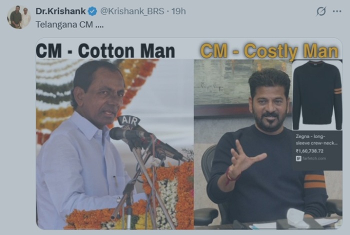 బీఆరెస్ నేత‌ల‌కు అధికారం ఉన్న‌ప్పుడు క‌ళ్లు నెత్తికెక్కి తైత‌క్క‌లాడారు. ఇప్పుడు అధికారం పోయి.. త‌ల‌తిక్కగా ఏదో ఒక‌టి వాగుతూ తిక్క స‌న్నాసిలా చేస్తున్నారు. ఇది అంద‌రికీ వ‌స్తుంది ఆ పార్టీలో. కేటీఆర్‌తో స‌హ‌. క్రిషాంక్ ఓ పోస్టు పెట్టాడు. ఏదో స్వామిభ‌క్తి ప్ర‌ద‌ర్శిస్తూ.. కేటీఆర్‌తోనో, కేసీఆర్‌తోనో శ‌భాష్ అనిపించుకోవాల‌నే యావే త‌ప్ప స‌బ్జెక్టు బేస్డ్‌గా మాట్లాడే ద‌మ్ము, తెలివి.. విష‌య ప‌రిజ్ఞానం వీరికి లేద‌ని వారే ప‌దే ప‌దే నిరూపించుకుంటూ ఉంటారు. మాజీ సీఎం కేసీఆర్‌ను కాట‌న్ మ్యాన్‌గా, ఇప్పుడున్న సీఎం రేవంత్‌ను కాస్ట్లీ మ్యాన్‌గా అభివ‌ర్ణిస్తూ ఇద్ద‌రూ ధ‌రించి ఉన్న దుస్తుల‌తో కూడిన ఓ ఫోటోను పెట్టుకున్నాడు. రేవంత్ వేసుకున్న టీ- ష‌ర్టు విలువ రూ. 1.60 ల‌క్ష‌లుగా ఉంది అని చెప్ప‌డ‌మే ఈ క్రిషాంక్ ఉద్దేశ్య‌మై ఉంటుంది. అదేదో సూటిగా చెప్పినా స‌రిపోయేది. ప్ర‌తీదానికి పోలిక అవ‌స‌రం క‌దా. పెద్ద సారును గుంజుకొస్తే.. ఇంకా రంజుగా ఉంటుంద‌నుకున్నాడు ఈ వివాదంలోకి.